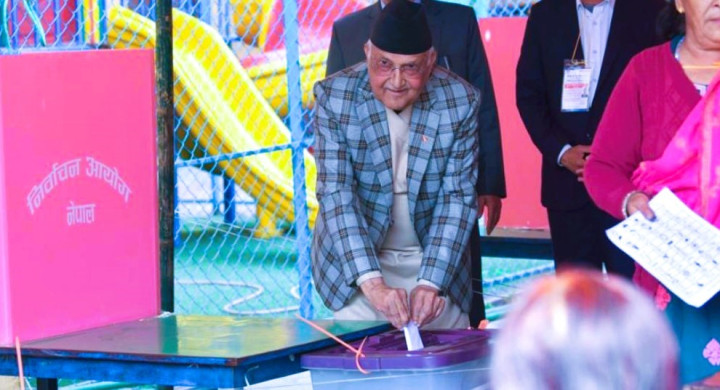 एमाले अध्यक्ष ओलीले भक्तपुरको बालकोटस्थित महेन्द्र शान्ति विद्यालयमा गरे मतदान
