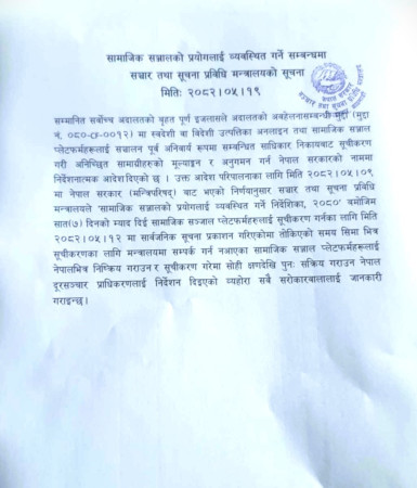 MMI संवादाता- सरकारले दर्ता नभएका सामाजिक सञ्जाल निष्क्रिय पार्न दूरसञ्चार प्राधिकरणलाई निर्देशन दिएको छ । सञ्चार तथा सूचना प्रविधि मन्त्रालयमा सूचीकृत हुन नआउने सामाजिक सञ्जाल बन्द गर्ने निर्णय गरेको प्रवक्ता गजेन्द्र ठाकुरले जानकारी दिए ।फेसबुक, ट्वीटर (हाल एक्स), युट्युब लगायत २६ वटा सामाजिक सञ्जाल बन्द गर्ने निर्णय गरेको छ। सञ्चार तथा सूचना प्रविधि मन्त्रालयले बिहीबार मन्त्रिपरिषदको निर्णय र सर्वोच्च अदालतको परमादेश कार्यान्वयन गर्दै उक्त निर्णय सार्वजनिक गरेको हो। मन्त्रालयले भनेको छ कि सामाजिक सद्भाव, राष्ट्रिय सुरक्षाका साथै नीतिगत दिशानिर्देशनअनुसार नियमनबिना सञ्चालनमा रहेका सञ्जालहरू नियन्त्रण गर्न यो कदम चालिएको हो।