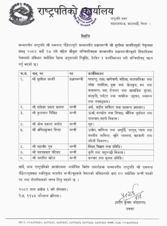MMI संवादाता- प्रधानमन्त्री सुशीला कार्कीले मन्त्रिपरिषद् विस्तार गर्दै देशको समावेशी प्रतिनिधित्वलाई प्राथमिकता दिँदै विभिन्न क्षेत्रका विज्ञ तथा जनप्रतिनिधिहरूलाई मन्त्रीमण्डलमा ल्याएकी छिन्। नयाँ मन्त्रीहरूमा चर्चित सञ्चारकर्मी जगदीश खरेल, सामाजिक उद्यम तथा अनुसन्धानमा सक्रिय महावीर पुन, शिक्षाविद् तथा समाजशास्त्री मदन प्रसाद परियार, र प्रशासनिक अनुभव बोकेका अनिल सिन्हा रहेका छन्। राष्ट्रपतिसमक्ष आयोजित विशेष समारोहमा चारै जनाले पद तथा गोपनीयताको शपथ लिएका हुन्। प्रधानमन्त्री कार्कीले देशको विकासमा विविध अनुभव भएका व्यक्तिहरूलाई सरकारमा ल्याउनु अहिलेको आवश्यकता भएको बताउँदै नयाँ मन्त्रिपरिषदले जनअपेक्षाअनुसार प्रभावकारी काम गर्ने विश्वास व्यक्त गरेकी छन्।